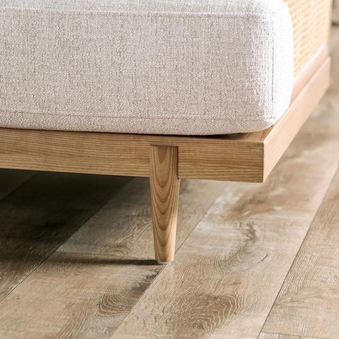 A perfect blend of retro and mid-century modern vibes, this sofa set is a welcome addition to any sophisticated home decor. Straight lines and blocky construction are kept in check by the loose back and bolster pillows with plush seat cushions. Natural elements such as ash wood trims and woven rattan panel help give this piece some organic flair. The beige fabric also provides much needed warmth to an otherwise sterile design. The result is a perfect balance of softness and rigidity that everyone can truly appreciate.