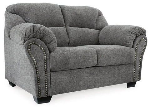 Why sacrifice comfort for style (or style for comfort) when you can have the best of both in this loveseat in pewter gray. Elements include a chic divided-back design and pillow top wrapped armrests that make nodding off all too easy. Calling attention to the elegantly flared armrests—black nickel-tone nailhead trim for a punch of cool character.