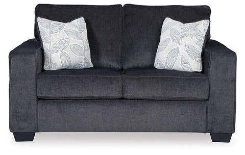 If style is the question, then this sofa and loveseat set is the answer. Sporting clean lines and sleek track arms, the decidedly contemporary profile is enhanced with plump cushioning and a chenille-feel upholstery, so pleasing to the touch. Sure to play well with so many color schemes, this sofa and loveseat set in slate gray includes understated floral pattern pillows for fashionably fresh appeal.