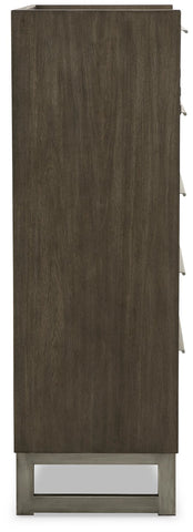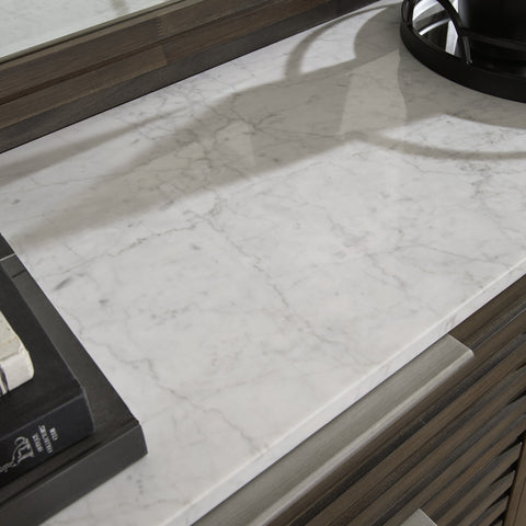 Clean lines lend sophistication and structure to this chest of drawers. Its complex rich grayish brown finish contrasts perfectly with a white marble top, while the streamlined silhouette features overlay slats to create visual interest. A metal base and bar pulls in a low-sheen steel finish add to this piece's contemporary vibe.