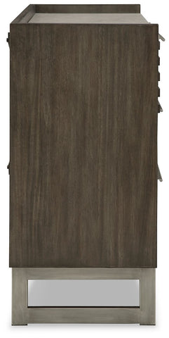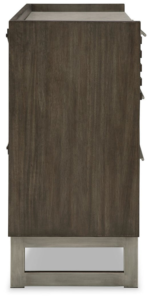 Clean lines lend sophistication and structure to this dresser with mirror. Its complex rich grayish brown finish contrasts perfectly with a white marble top, while the streamlined silhouette features overlay slats to create visual interest. A metal base and bar pulls in a low-sheen steel finish add to this piece's contemporary vibe.