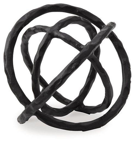 This sculpture brings contemporary art full circle. Interlocking metal rings in a black finish add an art gallery touch for a console table, bookshelf or mantel.