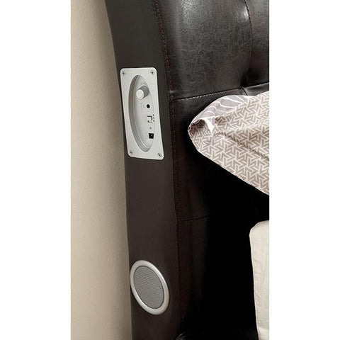 Make a bold and loud statement in your bedroom! This rather simple-looking bed is equipped with two bluetooth speakers on both sides of the headboard. Wirelessly connect your MP3 player and blast your favorite songs! Complete this mattress ready set with espresso finished case goods.
