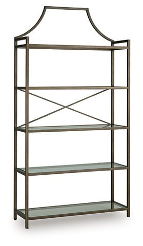 Classic design effortlessly blends with modern functionality in this elegant bookcase. Its antiqued bronze-tone finish adds a touch of warmth and sophistication, while the clear glass shelves create an airy and spacious feel. It’s exactly what you’ve been searching for to display your treasured books, digital picture frames or decorative accents.