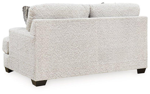 This loveseat speaks to those drawn to fresh, contemporary style with richly neutral appeal. Wrapped in a wonderfully plush fabric loaded with multi-tonal interest, this on-trend piece has a warm, welcoming charm. Coordinating accent pillows add to the indulgence. Kick back, relax and settle in for comfort with this cool addition for modern spaces.