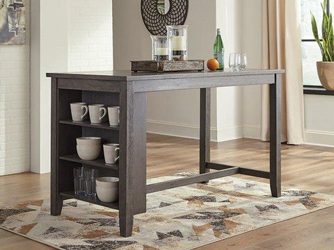 Perfect portion. Striking a simply chic pose, this dining room counter table serves up high style on a smaller scale. Its antiqued gray wash finish gives the clean-lined design a casually cool sensibility. Side shelves cleverly balance form and function.