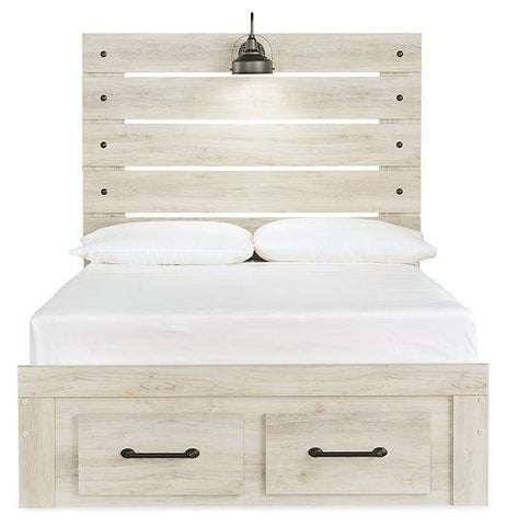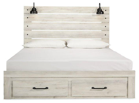 What a delightful take on rustic industrial style. Whether modern loft or modern farmhouse, this queen panel storage bed makes itself at home. The wispy whitewash palette enhances without covering the grain for that weathered look you crave. Love to read in bed? You’re sure to find the retro-chic light sconces and USB plug-ins on the open-slat style headboard such a bright idea. Elongated metal drawer pulls on the footboard storage drawers elevate the aesthetic.