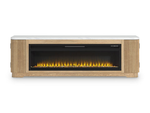 Elegance meets earthy charm in this TV stand with electric fireplace. Crafting a contemporary living room? The faux marble top expertly pairs with the reeded base for a trend-right take on day-to-day function. Open shelving and subtly integrated storage cabinets make it easy to store and display media accessories in style. For your added viewing pleasure, the wide fireplace insert gives you the cozy feel of a fireplace without the added hassle. With the touch of a button, adjust the temperature and the color-changing flames, and set the timer for long-lasting enjoyment. It comes with faux glass crystals and natural stones, so you can customize the look of the flame bed.