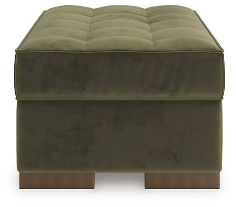 This sleek oversized accent ottoman offers a highly contemporary look with plenty of space to spread out. Dramatic tufted detailing and luxurious upholstery in a rich olive color create a sophisticated atmosphere. This ottoman is perfect for those who love to entertain, or simply relax, in uptown style and comfort.