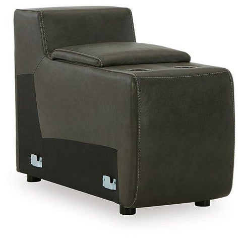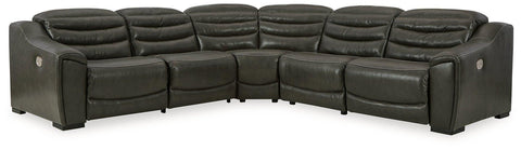For those seeking to curate a living room retreat that offers superior comfort and a contemporary aesthetic, this sleekly designed power reclining sectional will become your favorite source of at-home serenity. Rest on leather match upholstery, and use the one-touch power control to recline and adjust the headrests with ease. As you recharge after a long day, your devices can too with USB charging. This sectional is visually enticing in a luxe dark gray, with slope track arms and stitched detailing on the back to enhance its modern appeal.