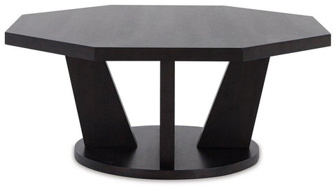 For the ultimate in casual contemporary styling, accent your sofa or loveseat with this chic coffee table. Designed with an octagonal top and trapezoid-shaped legs, its geometric elements create a bold, eye-catching look.