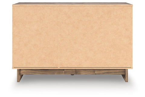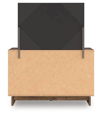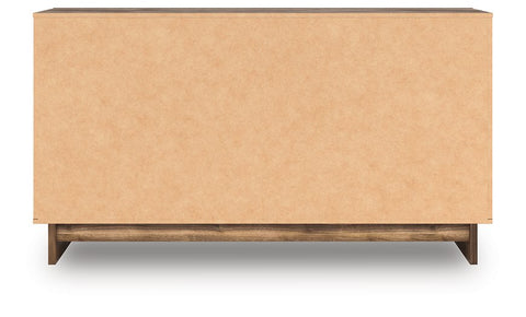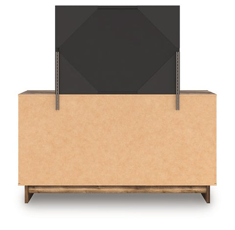 Nostalgic style, retooled for today’s trends. This dresser with mirror puts an elevated twist on mod aesthetics. Its warm brown tones reflect the mid-century vibes you love, while the angular base incorporates contemporary motifs. Integrated drawer handles round out the look in sleek style. With this dresser, you can build your bedroom into a modern haven with a touch of retro-cool flair.
