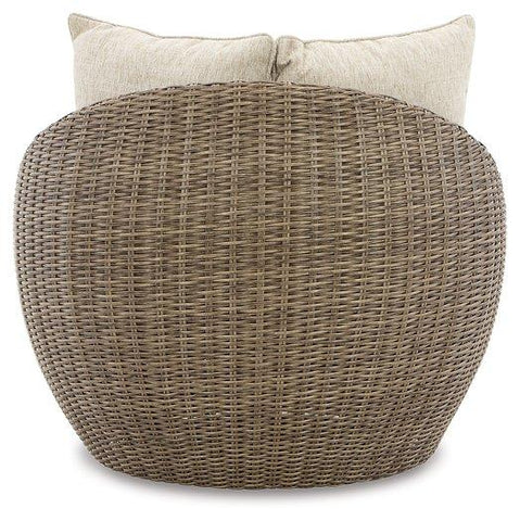 This swivel lounge chair completes your outdoor seating area with its fresh take on casual comfort. Handwoven resin wicker over a curving aluminum frame balances streamlined style and exceptional durability. High-performance beige Nuvella+™ fabric wraps the seat and back cushions, protecting against the natural elements.