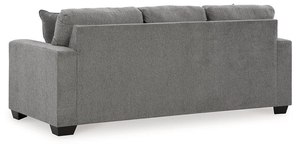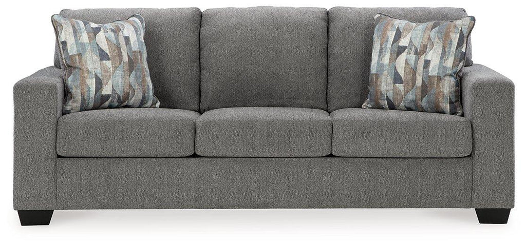 You’re in for a neat treat with this sofa. Its comfy seats are covered in soft, textural upholstery, and the wide track arms are eager to support your quest for total relaxation. Distressed abstract toss pillows bring a fresh breath of contemporary style while accentuating the sofa's color.