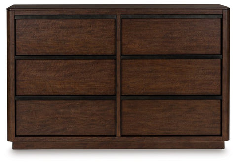 Casual contemporary styling with a decidedly modern vibe. This dresser is warm and inviting with a rich dark brown finish, adorning your restful retreat with on-trend elegance. Full-length metal pulls in a matte black finish add a subtly cool touch to spacious storage drawers. What a simply stunning way to achieve the bedroom of your dreams.