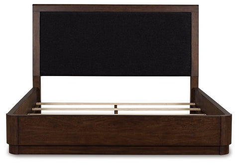 Casual contemporary styling with a decidedly modern vibe. Bathed in a rich dark brown finish, this queen upholstered panel bed is warm and inviting. Full wrap-around rails set to the floor adorn your restful retreat with on-trend elegance. A cozy upholstered headboard with layback comfort features USB charging on both sides to keep your electronics at the ready. What a simply stunning way to achieve the bedroom of your dreams.