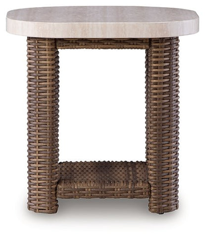Get back to nature with the relaxed styling of this outdoor end table. Crafted with a sturdy aluminum frame and resin wicker, it offers exceptional durability and style. A smooth tabletop with softly rounded edges holds nibbles, sips and more. And don't forget the handy lower shelf. Sounds like fabulous form and function to us.