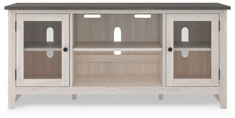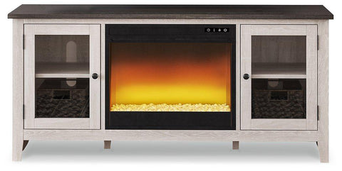 With its two-tone finish and minimalist charm, this TV stand with infrared fireplace insert is right in tune with your relaxed approach to high style. Beautifully made to accommodate your media equipment, it’s well equipped with adjustable shelving, cutouts for wire management and a pair of glass-front doors that enhance the clean-lined aesthetic. The look is ideal for modern farmhouse and contemporary settings. What really turns up the heat: an electric infrared fireplace insert with faux firebrick surround that operates with or without infrared heat and includes a multi flame feature, 7-level temperature setting, five brightness levels and LED glowing embers effect.