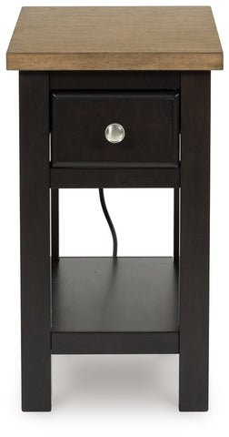 When you’re styling your living room, convenience is key. With this chairside end table, casual flair meets can’t-miss function. Tired of trekking to find a charger when your device is dead? This table's built-in outlets and USB ports allow you to stay at ease in your favorite seat. The fashionably functional piece pairs a dark chocolate brown with a light wood tone, complementing a variety of color palettes.
