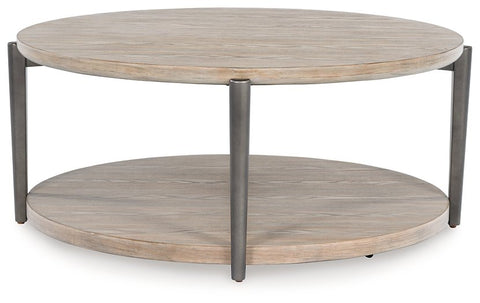 Merging industrial and contemporary elements, this coffee table turns display space into an art form. The whitish brown wood-tone finish is right on trend, while contrasting painted metallic legs offer a modern touch of stripped-back beauty. With its streamlined design, this table proves that less is more.