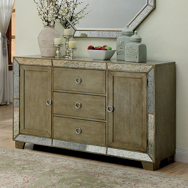 Dine in style with this fabulous Antique Gold finished dining server. Antique mirrors accent the set, adding soft reflections that glimmer in natural light.