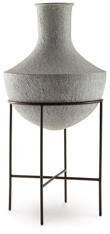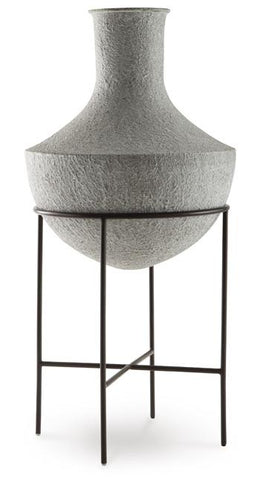 Take an effortlessly inviting approach to floor decor. This vase's distressed, textured look in a neutral hue pairs with a variety of casual color palettes. An espresso brown stand adds charming contrast to the look. And this vase enthusiastically welcomes faux florals and filler, perfectly adapting to the seasons when you swap out your arrangements.