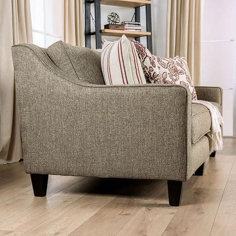 A humble design that plays up the comfort and coziness of neutral tones and compact shapes. The low sloped arms, hold in two box cushions that sink just enough when you sit, and help contain ample back cushioning. A scattering of pillows adds a touch of pattern and color to this set. Add this collection to your home for an instant touch of welcoming comfort.