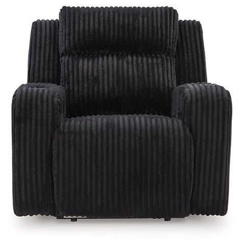 Trend-right style, meet irresistible modern function. Your living room gets a cozy-cool upgrade with this power recliner. Curl up in its ultra-chic corded upholstery and recline with one-touch controls. Is it movie night or game time? With ambient LED lighting, this recliner transforms from a serene relaxation spot to an entertainment hub. USB charging, cup holders and storage cutouts make lounging all the more convenient.