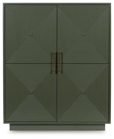 This accent cabinet makes a big impact with just one piece. Its intricately patterned doors impress with their dimension, while the dark green finish and sleek goldtone handles add a touch of modern elegance. Adjustable shelves add everyday functionality to this sophisticated yet approachable piece.