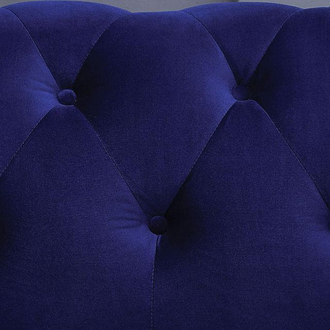 GIACOMO Loveseat, Blue, 65"L X 35 1/2"W X 30 1/2"H (SEAT HT: 19 1/4", SEAT DP: 23 3/4"), 107.8lbs. The chesterfield style is here to stay. This incarnation of the beloved piece share the same iconic details--the button-tufted seat and back, high rolled arms, nailhead trim, and turned bun legs. Velvet-like fabric wraps around this love seat, while the faux-fur fabric pillows are included for tasteful accent. Nothing says luxury like an 80's Hollywood-inspired living space just like this.