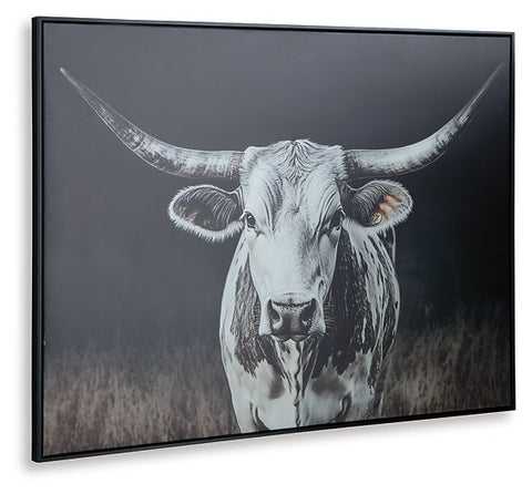 Add homespun charm to modern farmhouse and casual spaces. A longhorn cow takes center stage in this wall art, its white coat contrasting beautifully against the dark background tones. A sleek black frame completes the look.