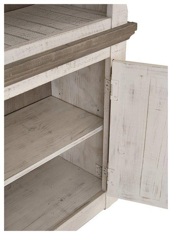 Set your sights on modern farmhouse style with this pier cabinet. Its distressed two-tone treatment blends a weathered gray with vintage white for an utterly charming effect. Turned posts lend a hearty, substantial look that feels right at home, while three open shelves and a cabinet suit all your storage needs.