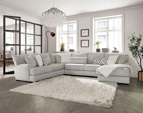 An epitome of comfort, this oversized sectional is made for the ultimate form of relaxation. Posh channel design on the back cushions and the throw pillows add visual appeal to the sofa's clean lines and solid gray color. Lounge on the wide chaise or lean your head over the low padded arms. An optional armless chair can be added to extend the length of the sectional. The tightly woven chenille is brimming with softness and welcoming to every tired and drawn out soul.