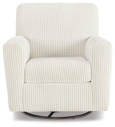 Comfort and class, combined. With its clean lines, open attitude and classic swivel glider design, this accent chair is a great addition to your living room. Along with the 360-degree swivel, it provides an enjoyable sit on a generous seat cushion. The chair's family-friendly upholstery stands up to wear and tear while indulging in a soft look and feel.