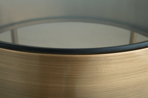 This table set combines metal and glass materials for a stylish and functional home accent. Tubular legs provide a sturdy base, while the aged brass-tone metal apron adds an elegant touch. A black tempered glass tabletop offers both sleek aesthetics and durability. With a modern design and high-quality craftsmanship, the set is a wonderful display of great taste.