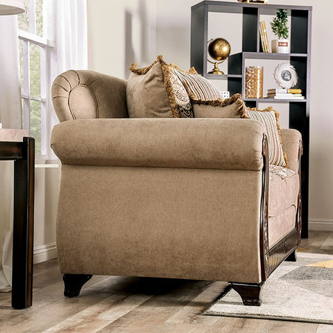 Ornately carved wood details highlight this unique mocha fabric-upholstered solid wood love seat that has been proudly made in the U.S.A. As an American product, you can count on its durabilty and longevity.