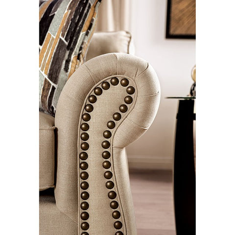 It's sandy-colored elegance with this classic design, a plush American-made tan love seat complete with fancy nailhead trim accents and stained wood double bun legs!
