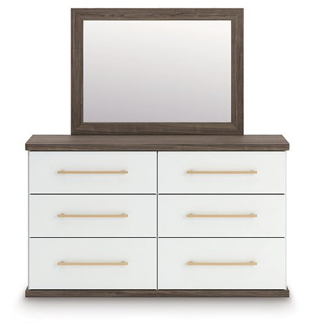 Looking to make a subtly striking statement in your bedroom? We've got you covered. A sophisticated two-tone treatment on this dresser with mirror marries a warm brown finish over replicated walnut grain with a matte white finish. The dresser's rounded corners and thick top radiate an air of modern panache, while sleek handles in a champagne finish add a sparkling touch to the spacious drawers. Itās a master class in contemporary yet comfortable character.