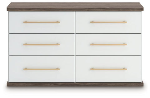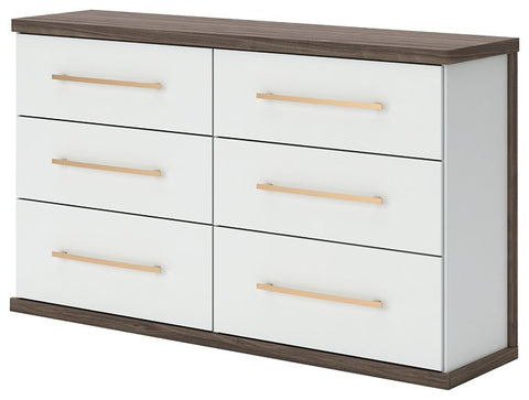 - Dresser with two-tone finish (dark brown finish over replicated walnut grain; matte white finish)