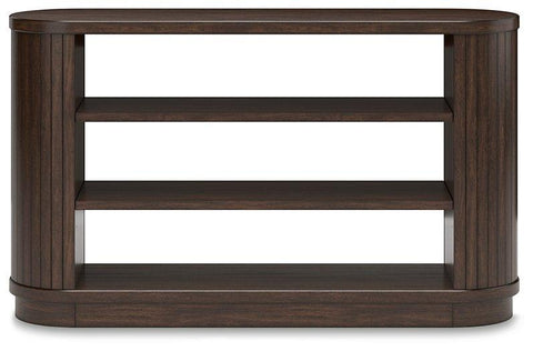 This credenza is perfectly modern in every way. Finished on both sides in a rich wood tone, the bookcase can be floated in a room or used as a divider. Adjustable shelving and open storage deliver a well-organized space for work-from-home professionals. It's a striking study in upscale contemporary form and function.