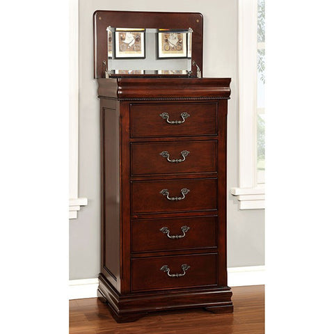 Exquisite design detail and luxurious English styling makes these case goods an intricate piece in completing that ultimate classic bedroom. An optional lingerie chest with a jewelry case on top completes this wonderful suite finished in cherry.