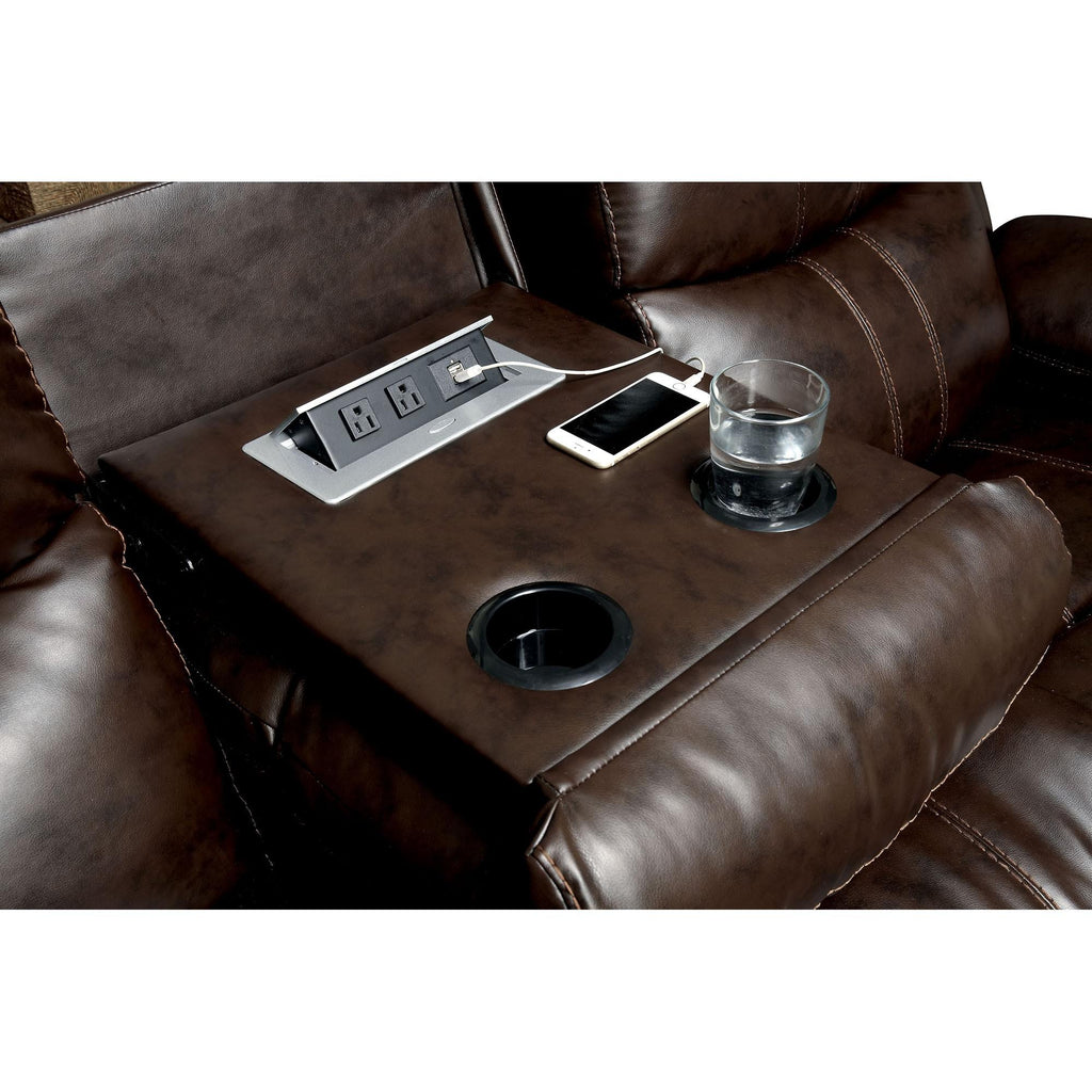 Listowel Brown Love Seat, 59"L X 36"W X 40 1/2"H, 155lbs. Spend your down-time putting your feet up on this sofa set! Flip up the footstools on these reclining seats and lean back to find that perfect relaxation spot. The center backrest of the sofa can be lowered to reveal a concealed table top with a conv enient USB plug. Upholstered in luxurious bonded leather and featuring plush armrests and headrests, this sofa set is perfect for making the most of your relaxation time. Features: Transitional Style Stitched Detail Bonded Leather Match Recliners Plush Cushions Brown