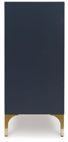Elevate your aesthetic with the chic design of this accent cabinet. Sleek goldtone legs and striking doors with a geometric pattern infuse contemporary flair wherever you place this piece. Add a dark blue finish, and you've got a stunning showstopper. Providing function to form, the cabinet's push magnetic doors reveal two shelves and openings for electronics.