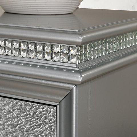 MADDIE Night Stand, Silver, 29 1/2"W X 17 3/8"D X 27"H, 110lbs. Create a room with this night stand from the Maddie Collection. The acrylic legs and crystal accents bring a glamorous aesthetic. Give into your glitzy side with this opulent night stand.
