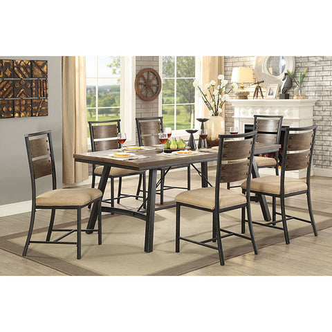 Characterize your dining room with this rustic industrial dining set. Bolt accents add bold detail to the ladder back chairs and vibrant upholstery creates warming accents. The wooden bench flares with angled legs and its sleek wooden seats offer soothing comfort. Tied together with a spacious wooden table, the set blends beautifully in your home. The airy table base welcome natural light and splayed legs create visual intrigue that leaves your dining room with a tempting allure.