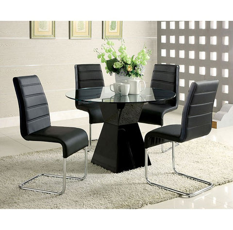 Brighten up any dining room with this contemporary round glass dining set. The table sits on a single modern base. The chairs are padded and upholstered in leatherette and chrome legs.