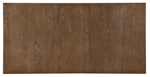 Delight family and guests alike in this rich rustic oak ensemble. The dining table features a distinctive trestle base with circular legs and wide stable feet, holding up a spacious table top, which expands with an 18-inch leaf. The bold table top and base are complemented beautifully with the same circular motif found on the backs of the wooden matching chairs. Seat cushions are padded in a warm beige linen fabric that helps achieve an artful balance of beauty and function.