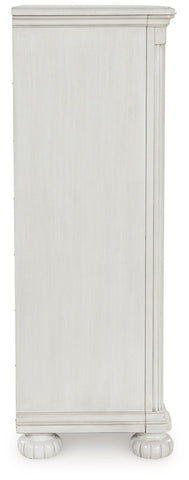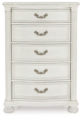 Transform your inner sanctum into a haven of timeless elegance and functionality. This traditionally styled chest of drawers is adorned in a classic antiqued white finish, highlighted by a serpentine-shaped front with thick decorative moulding. Its drawers are packed with ample storage possibilities. And did we mention the stylish reeded bun feet? Talk about relaxed refinement.