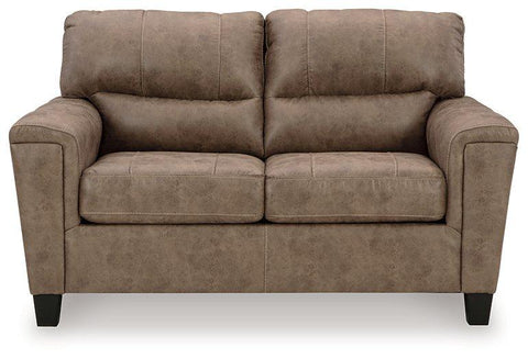 If you love the cool look of leather but long for the warm feel of fabric, you can take comfort in this loveseat. Wrapped in a fabulous faux leather with a weathered hue and hint of pebbly texture to resemble the real deal, this decidedly modern loveseat proves less is more. Elements include angled side profiling and track armrests wrapped with a layer of pillowy softness for that little something extra. Prominent jumbo stitching and clean-lined divided back styling lend fashion-forward flair.