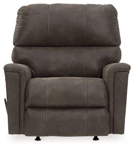 If you love the cool look of leather but long for the warm feel of fabric, you can take comfort in this rocker recliner. Wrapped in a fabulous faux leather with a weathered hue and hint of pebbly texture to resemble the real deal, this decidedly modern recliner proves less is more. Elements include angled side profiling and track armrests wrapped with a layer of pillowy softness for that little something extra. Prominent jumbo stitching and clean-lined divided back styling lend fashion-forward flair.